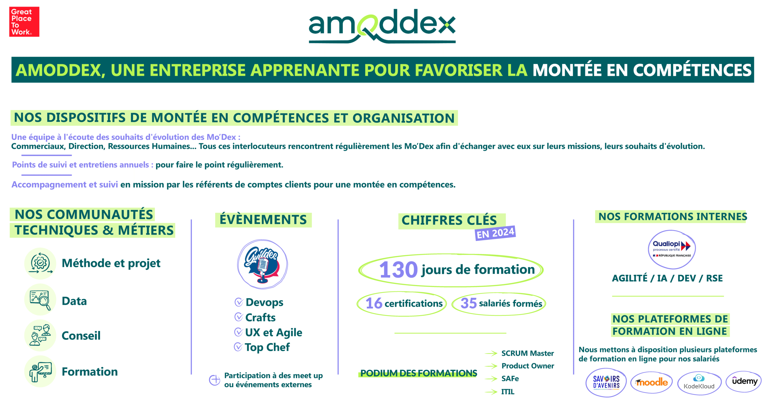 Amoddex accompagne les membres de son équipe à travers un parcours de formation individualisé couvrant méthodologie et savoir-faire technique.