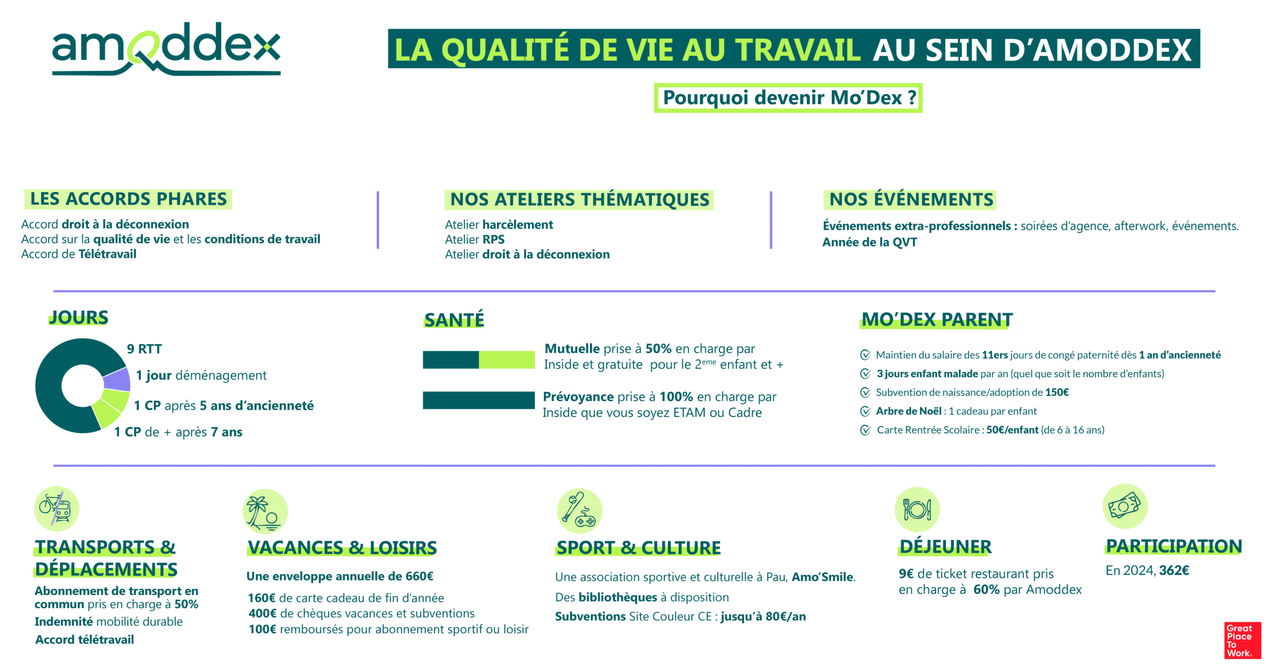 Chez Amoddex, nous allions performance et bien-être en offrant un environnement flexible, respectueux de l’équilibre vie pro/perso et propice à l’épanouissement. Grâce à des initiatives Qualité de Vie au Travail, une écoute managériale constante et des événements extra-professionnels, nous cultivons une ambiance conviviale, bienveillante et stimulante pour nos équipes.